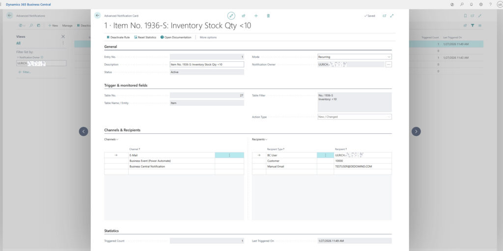Lassen Sie sich über selbst erstellte Regeln zu Ereignissen in Business Central über verschiedene Kanäle benachrichtigen.