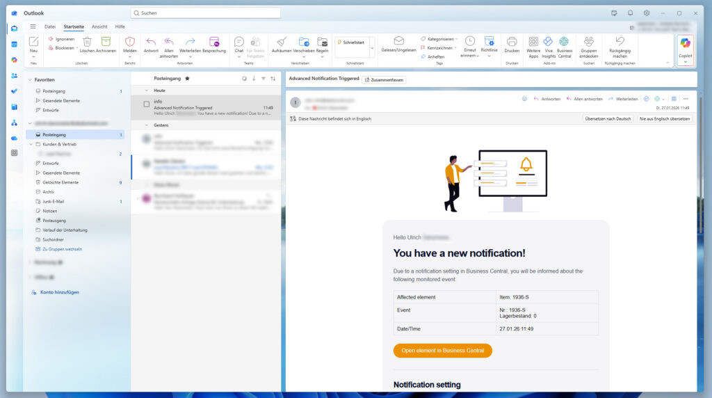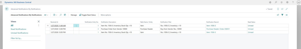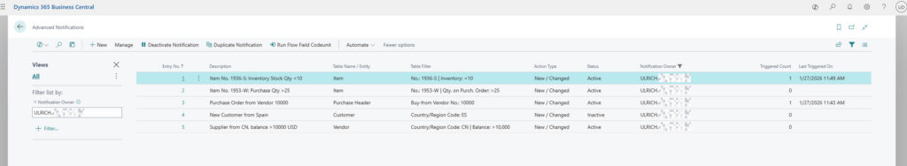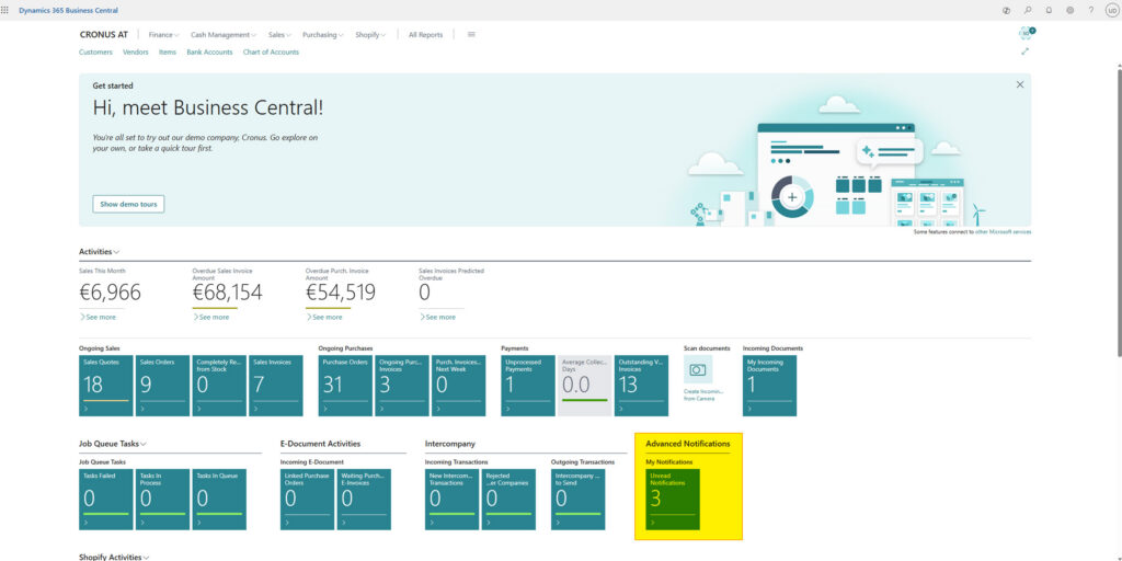 - Business Central – My Notifications: Ereignisse werden in einer eigenen BC Seite gelistet. Dort können Sie jederzeit vom Empfänger eingesehen werden. Diese Elemente lassen sich auch bequem auf einer Business Central Rollencenter Kachel platzieren.